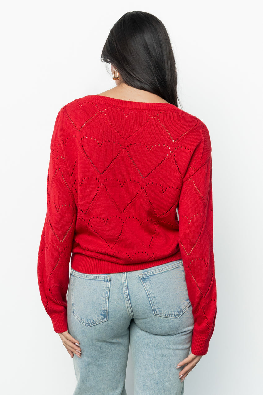 Elevate everyday outfits with the Heartfelt Sweater Top by. This lightweight, red knit features a playful heart-shaped open-weave pattern that adds subtle romance without bulk. The soft blend and gentle stretch make it comfortable for layering or wearing on its own.