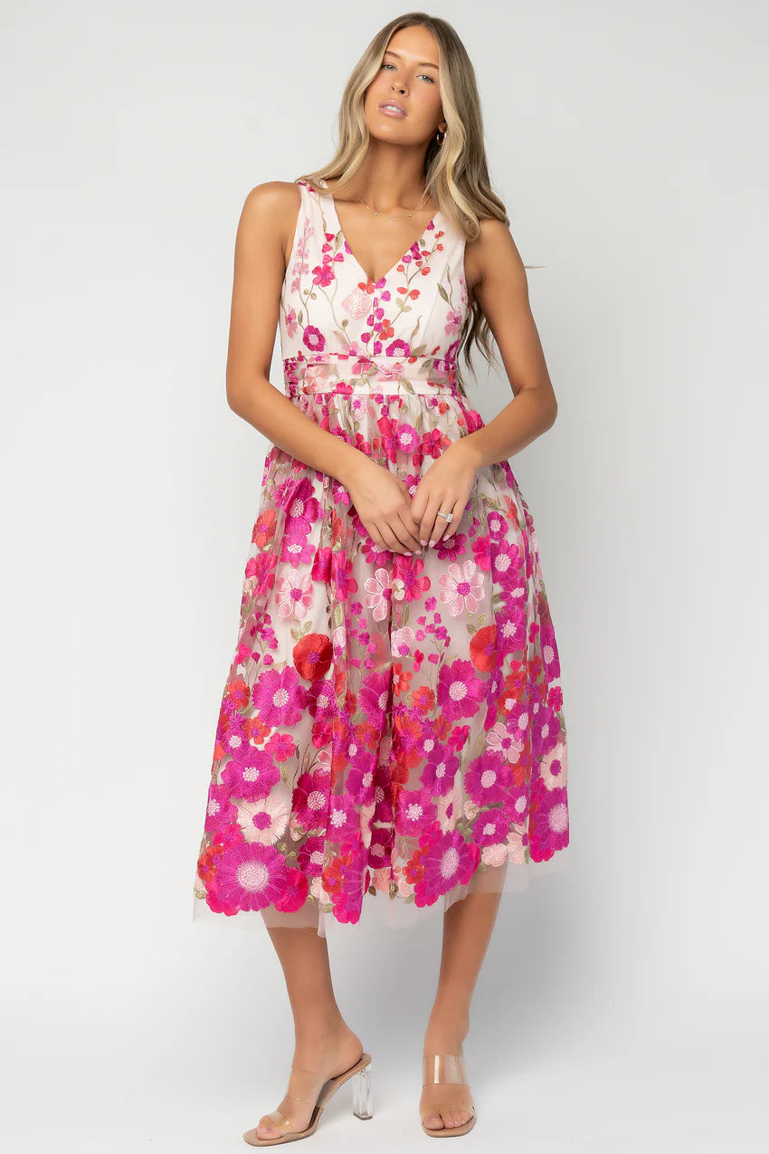 The Lila Embroidered Midi Dress is a romantic tulle silhouette in soft pink with multi-hue floral embroidery. Lightweight and feminine, it layers airy tulle over a smooth lined base for comfortable wear at weddings, showers, and garden events.