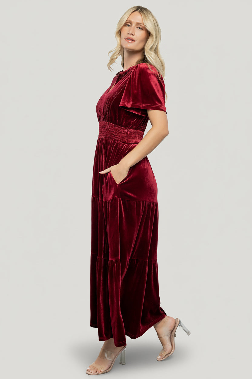 Elegant Maida embroidered velvet maxi in deep cranberry with a slightly stretchy hand and full lining for comfortable all-day wear.